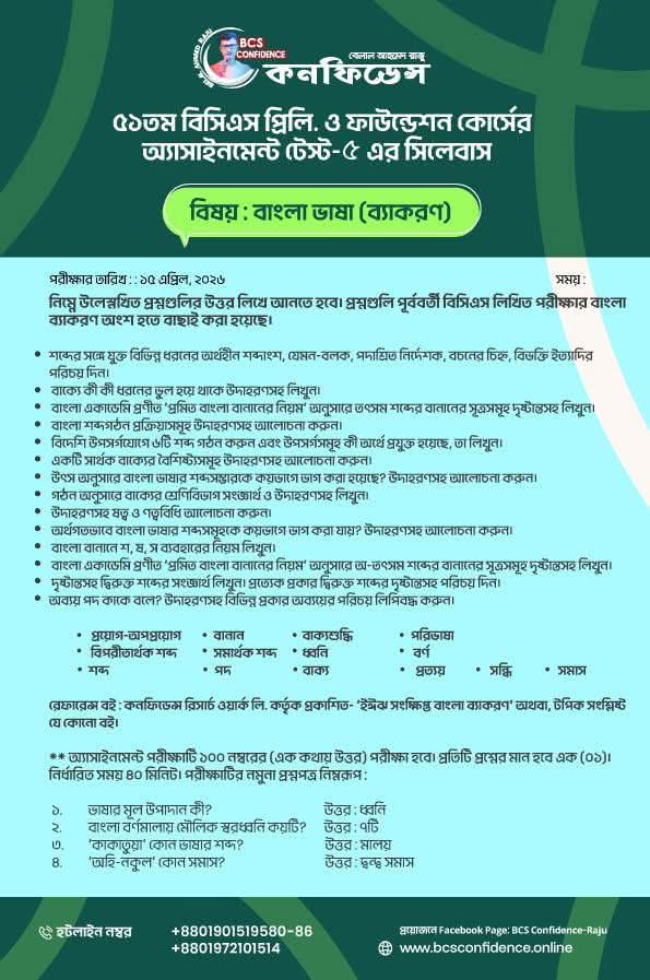 ৫১ তম বিসিএস প্রিলি অ্যাসাইনমেন্ট টেস্ট-০৩ আগামী ১৫ মার্চ ২০২৬ তারিখ সন্ধ্যা ৭ টা থেকে শুরু হয়ে ১৬ মার্চ ২০২৬ রাত ১১.৫৯ পর্যন্ত যেকোনো ৬০ মিনিট পরীক্ষা দেওয়া যাবে।