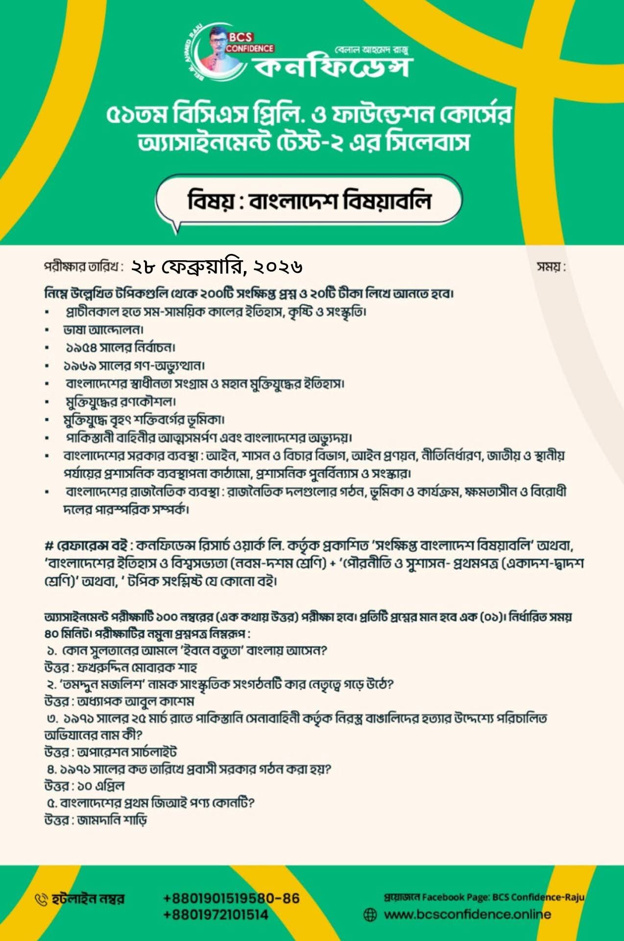 ৫১ তম বিসিএস প্রিলি অ্যাসাইনমেন্ট টেস্ট-০২ আগামী ০১ মার্চ ২০২৬ তারিখ সন্ধ্যা ৭ টা থেকে শুরু হয়ে ০২ মার্চ ২০২৬ রাত ১১.৫৯ পর্যন্ত যেকোনো ৬০ মিনিট পরীক্ষা দেওয়া যাবে।